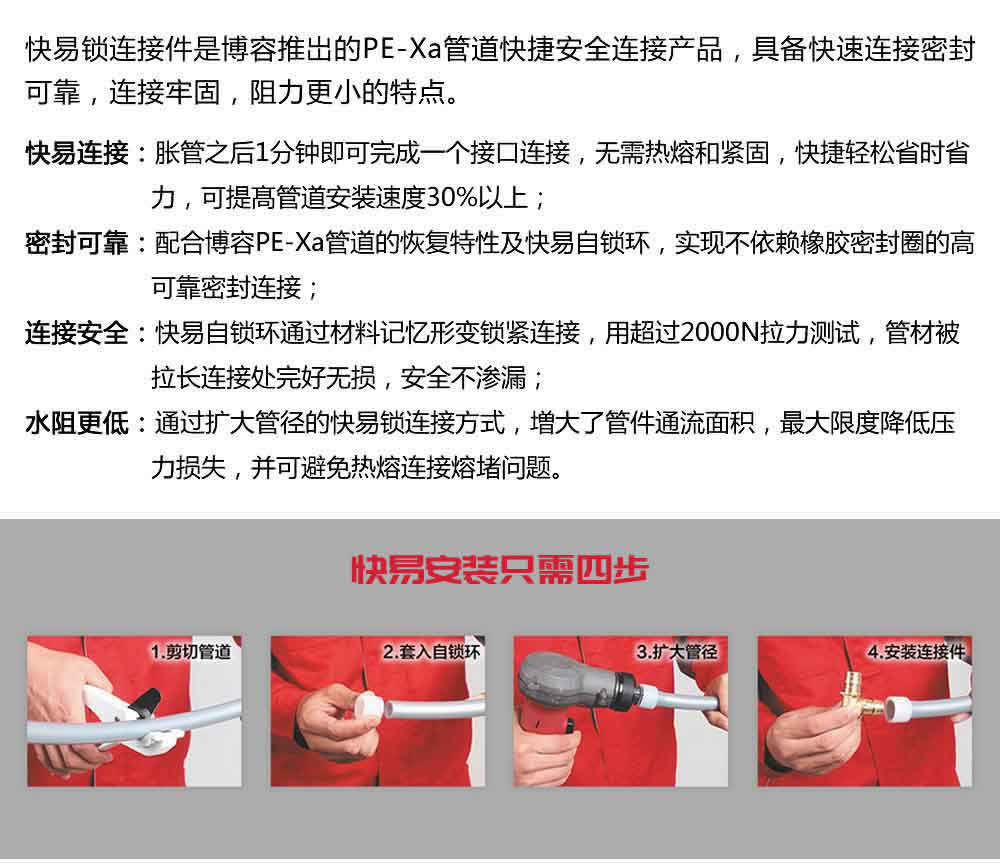 快易安裝只需四步:脹管之后1分鐘即可完成一個接口連接,無需熱熔和緊固,快捷輕松省時省力。