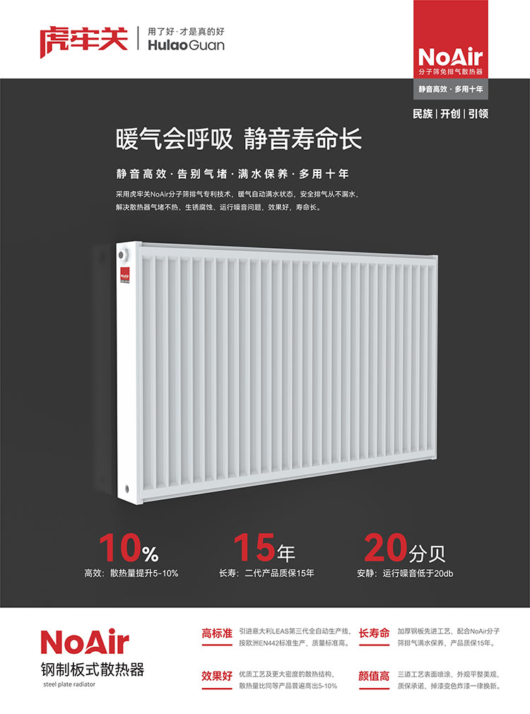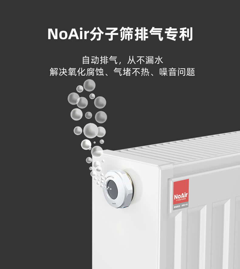 特點:采用虎牢關NoAir分子篩排氣專利技術,暖氣自動滿水狀態,安全排氣從不漏水,解決暖氣片氣堵不熱、生銹腐蝕,運行噪音問題。